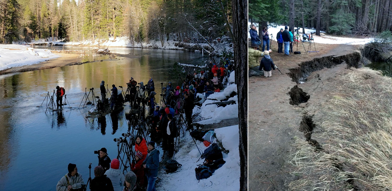 This is typically at its worst the weekend of Presidents’ Day, when over 2,000 visitors pack into a small section of riverbank. As riverbanks filled, visitors moved into the Merced River, trampling sensitive vegetation and exposing themselves to unsafe conditions. In the aftermath of Firefall, undeveloped areas were littered with trash, and the lack of restrooms resulted in unsanitary conditions.